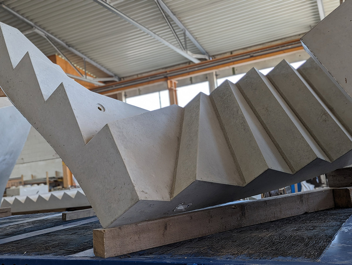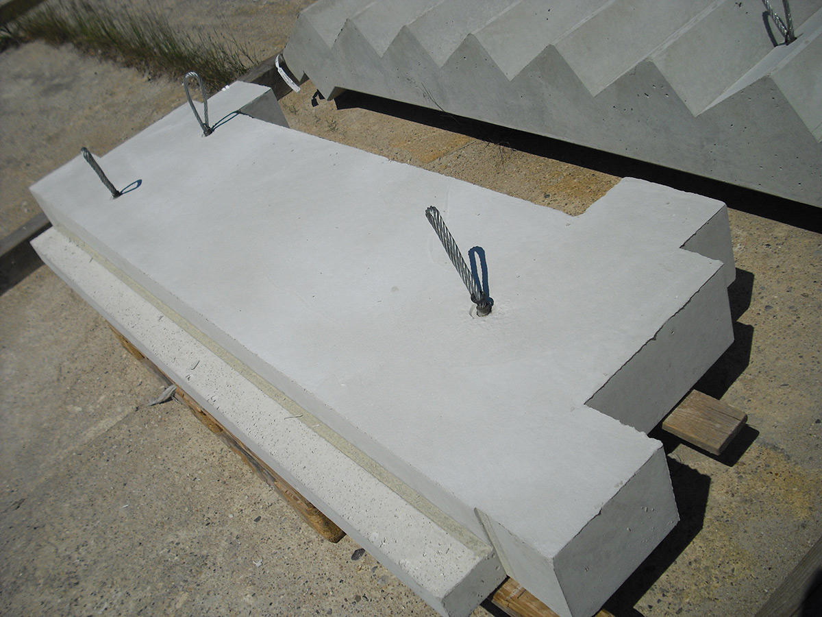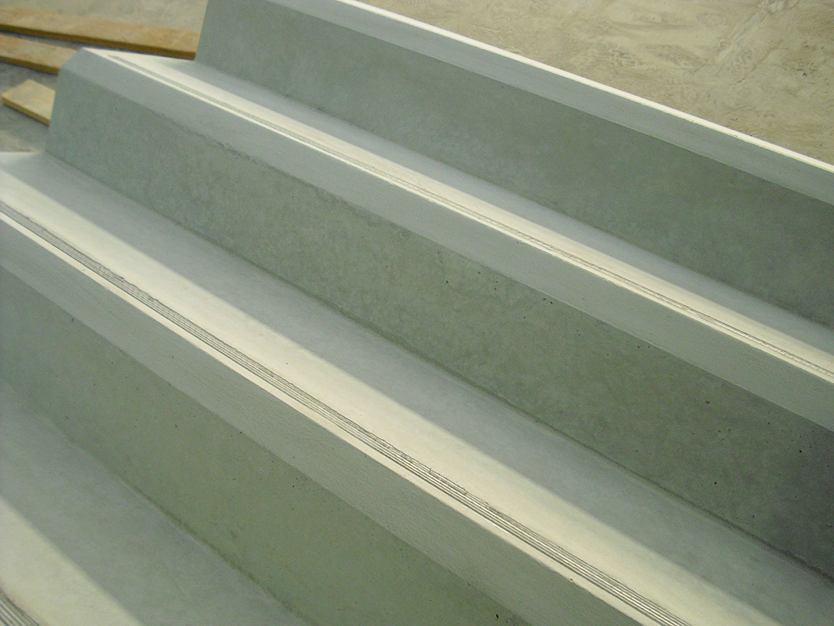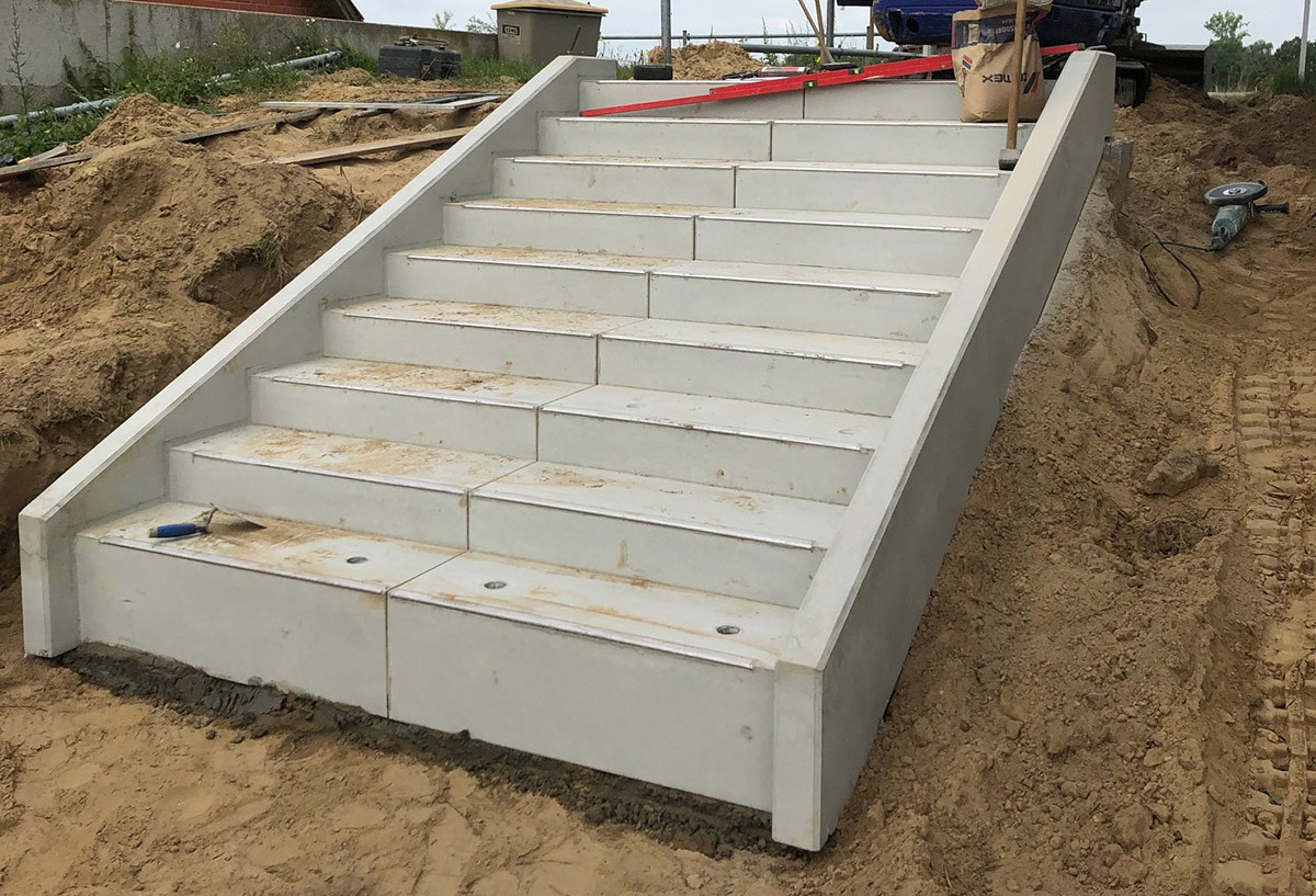 Als Stahlbetontreppen sind gerade Treppenläufe oder gewendelte Treppenläufe herstellbar. Die Erweiterung mit angeformten Podesten ist möglich.